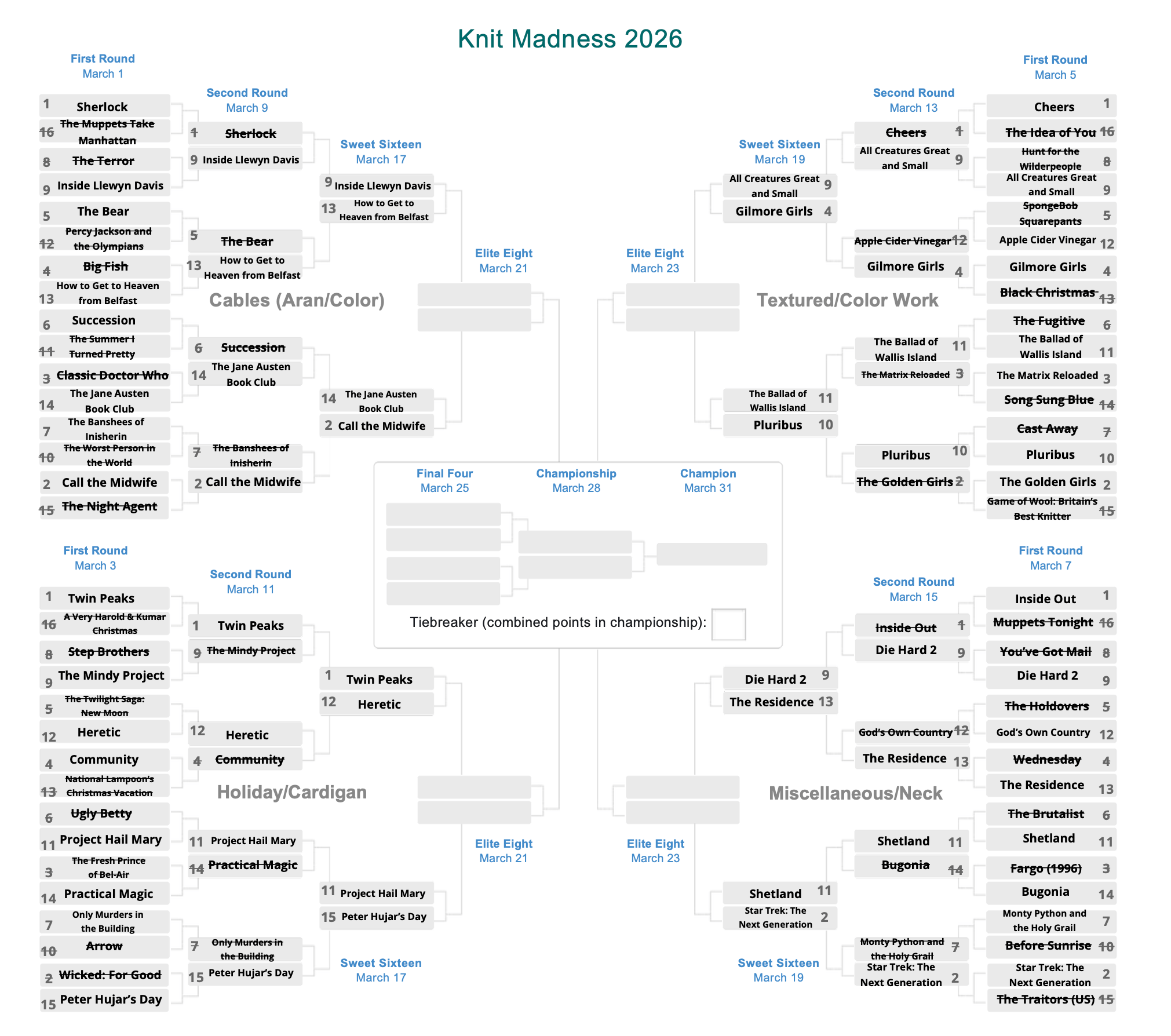 Now that we’re 17 days into March, ¾ of the sweaters in the bracket have fallen—and that includes yet another no. 1 ranked sweater. Sorry, Pixar, although I imagine it’s got bigger self-inflicted controversies to contend with at the moment.
