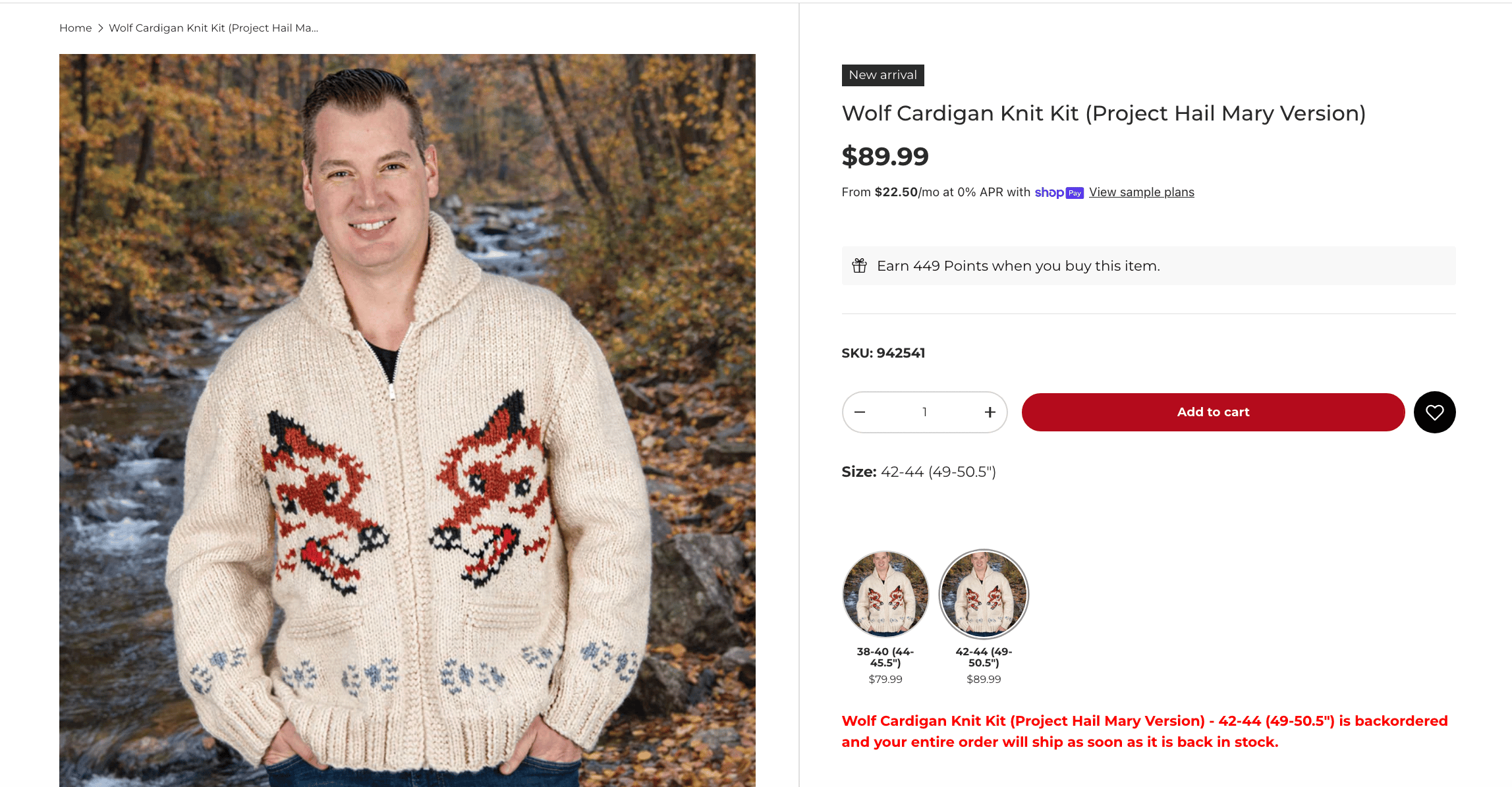1 Mary Maxim is only selling the Project Hail Mary version of the cardigan as a kit (yarn + pattern) at the moment and is limited by size, but if you’d rather just take your chance with the original pattern, it’s a much more manageable price at $7.99—$5 more than it was when I first published this newsletter—and you can use whatever yarn you want.