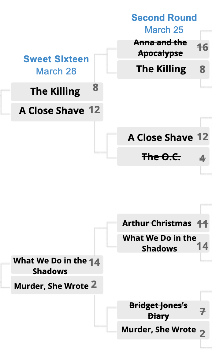 For what I believe is the first time, every winner of yesterday’s matchups had at least 60% of the vote—not a close one. But with A Close Shave and What We Do in the Shadows heading to the Sweet Sixteen, we’ve got a few more underdogs entering the next arena.